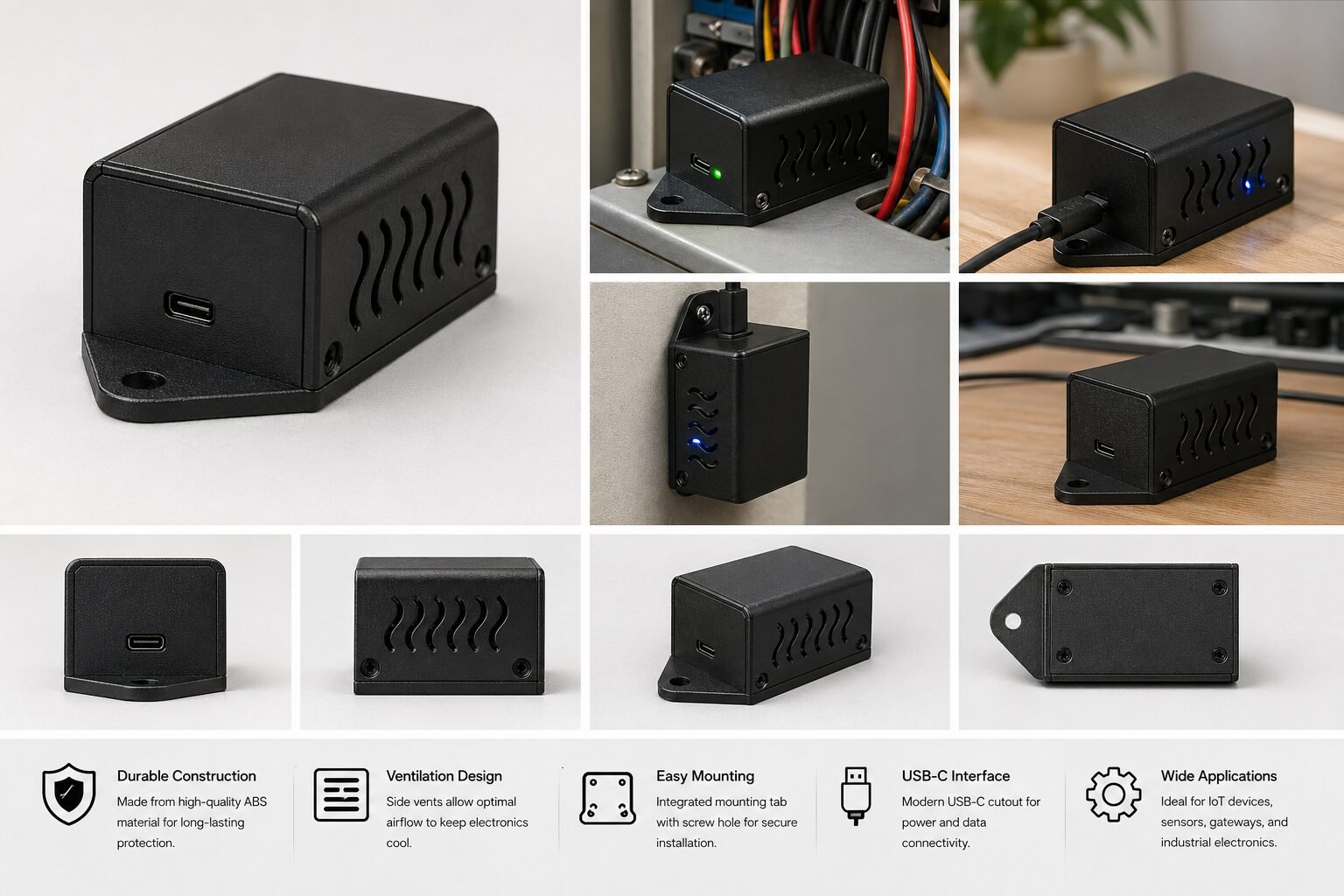 This Matte Black Vented Project Box is a precision-engineered enclosure designed for compact electronics and IoT devices. Featuring a professional sandblasted texture, it includes a pre-integrated USB-C port cutout and wavy side ventilation slots to ensure optimal heat dissipation for internal components.