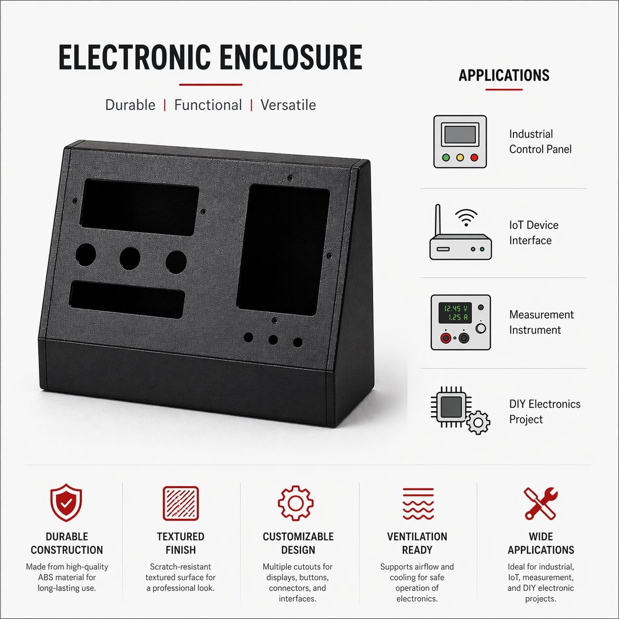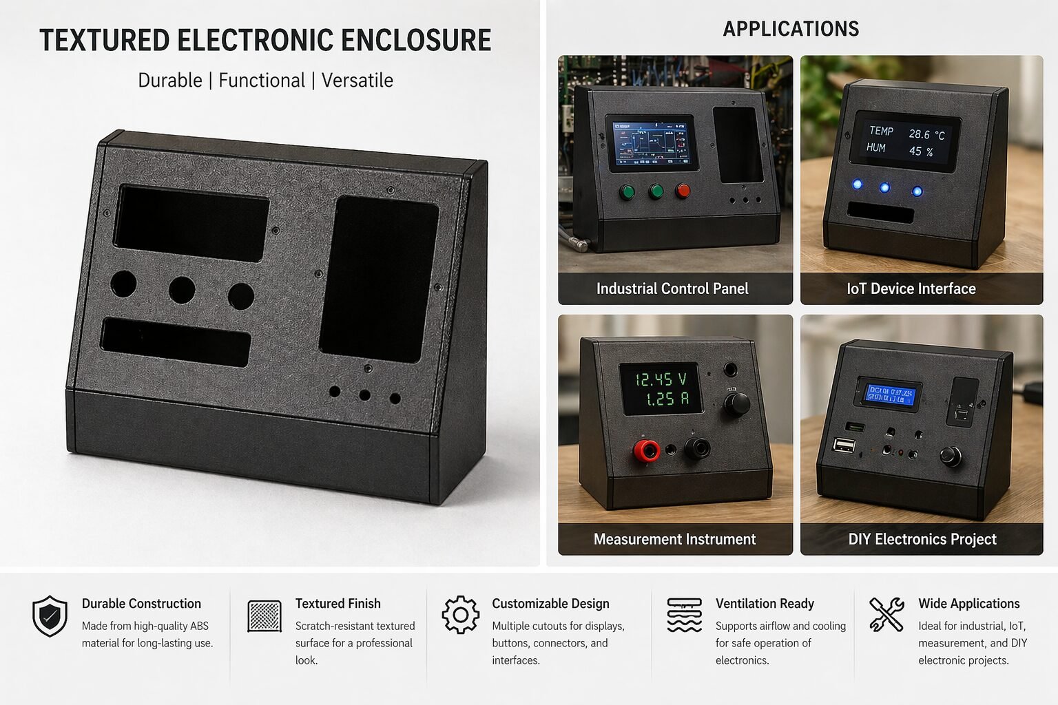 This custom electronic enclosure is made from high-quality ABS material, ensuring durability and long-lasting performance. Its textured matte finish provides a professional and scratch-resistant surface. Designed with versatile cutouts, it supports displays, buttons, and connectors easily. Ideal for industrial control panels, IoT devices, measurement instruments, and DIY electronics projects, offering reliable protection and efficient airflow support.